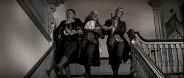 “Bustibility, Combustibility!” from left to right: Robert Livingston, Benjamin Franklin, and Roger Sherman irking John Adams to their utmost ability in the immortal sequence of “But, Mr. Adams”.